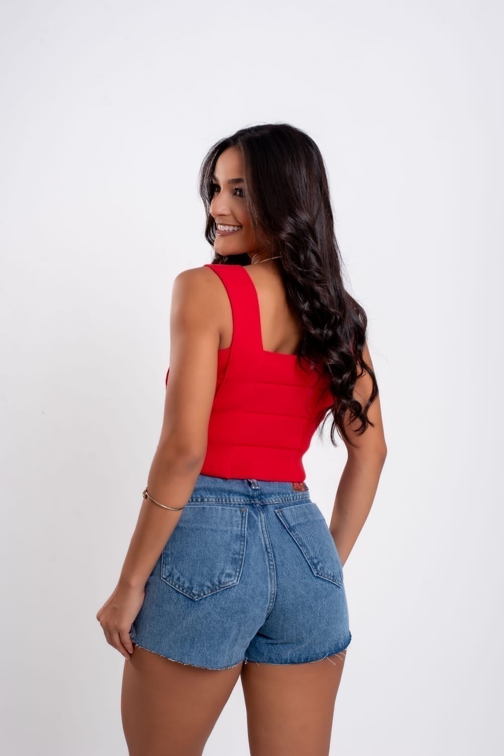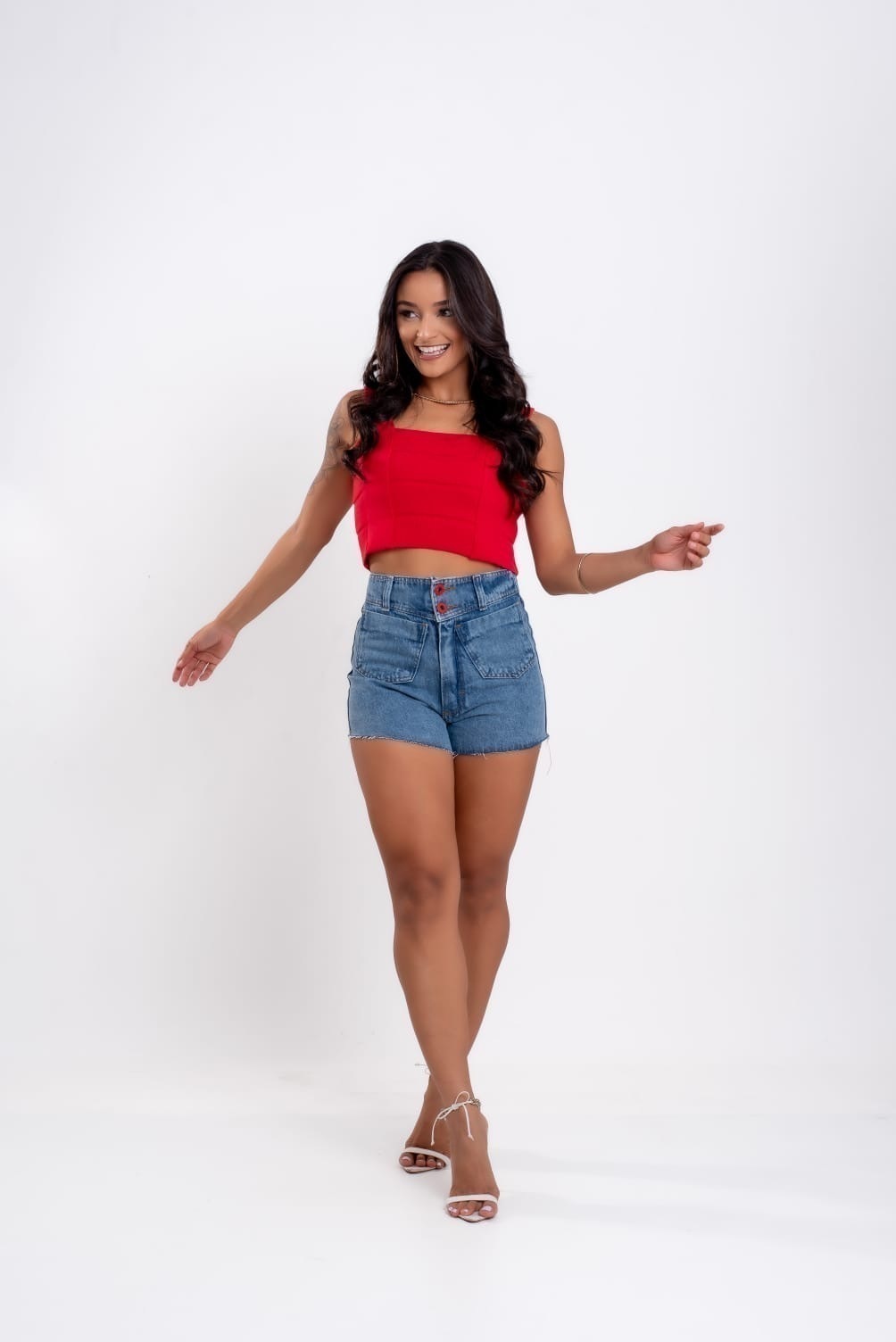 O short jeans é confeccionado inteiramente em tecido 100% algodão, proporcionando conforto. Seus bolsos frontais são distintos, apresentando um design único. A barra é detalhada com acabamento em fio, conferindo um toque diferenciado. O recorte geométrico adiciona um elemento moderno, enquanto os botões vermelhos proporcionam um contraste vibrante. A lavagem diferenciada confere um visual único e estilizado à peça.